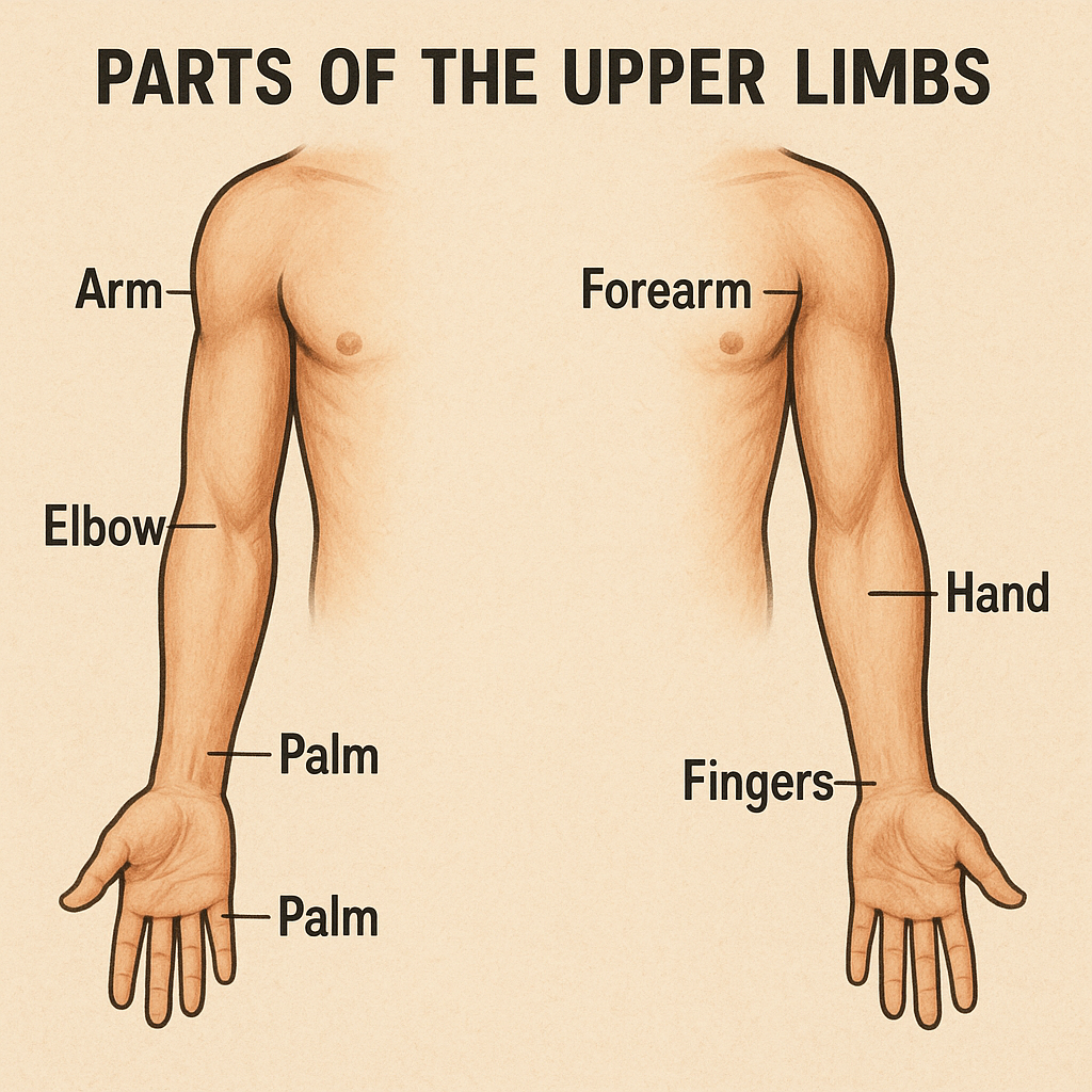 - Fingers: There are four fingers on each hand that help us grip and touch things.